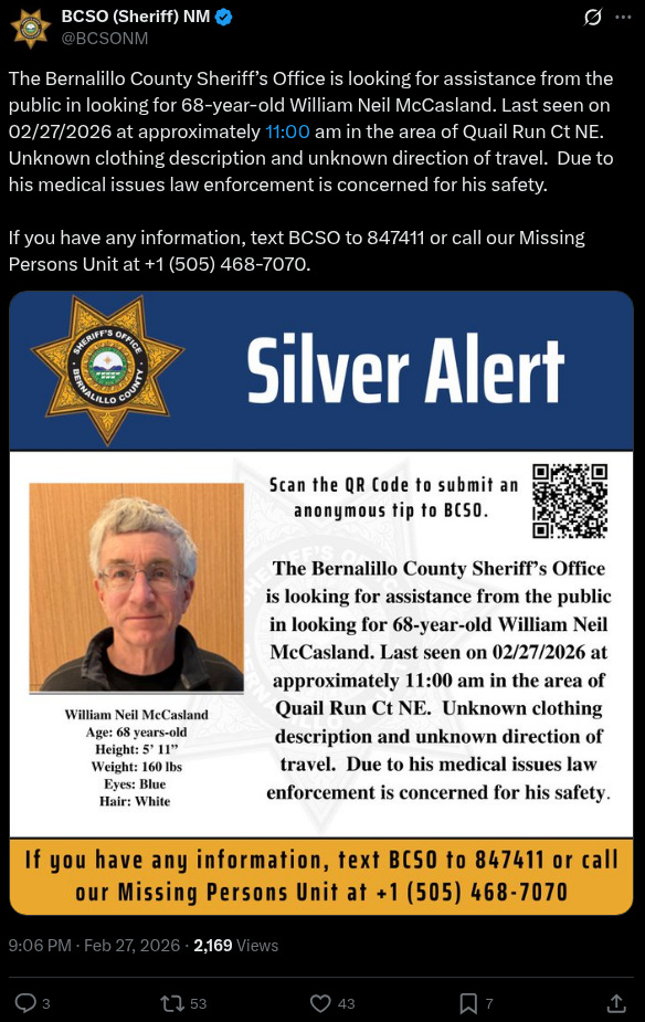 The Bernalillo County Sheriff’s Office, which is leading the search for McCasland, has issued a Silver Alert for his disappearance.