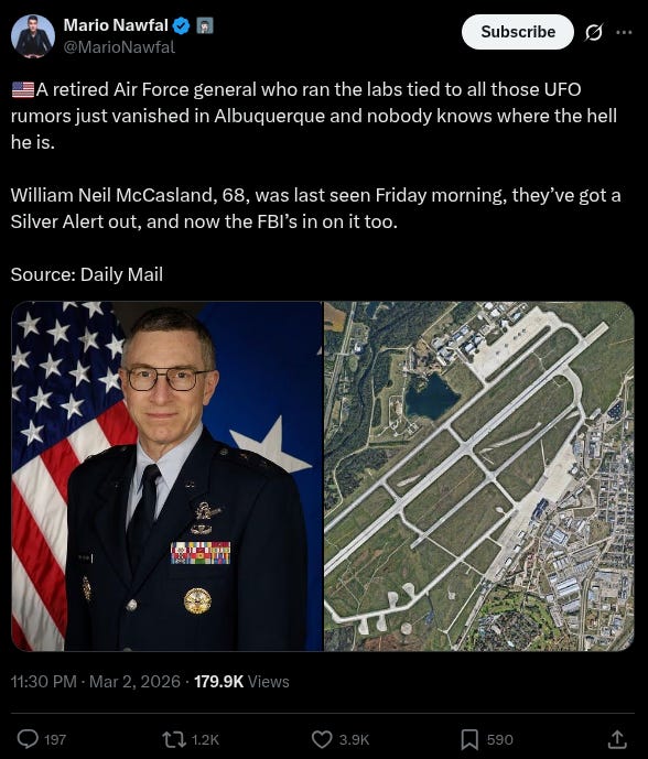 The same general tied to all those UFO rumors just vanished in New Mexico and nobody know where he is.
