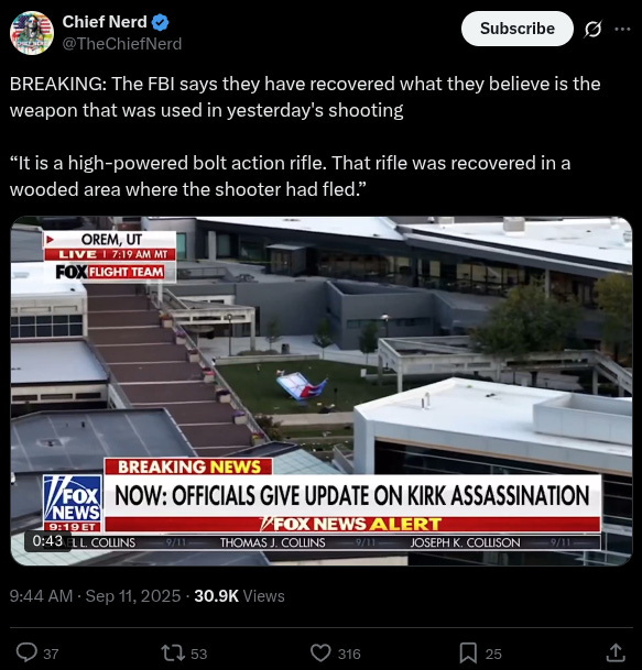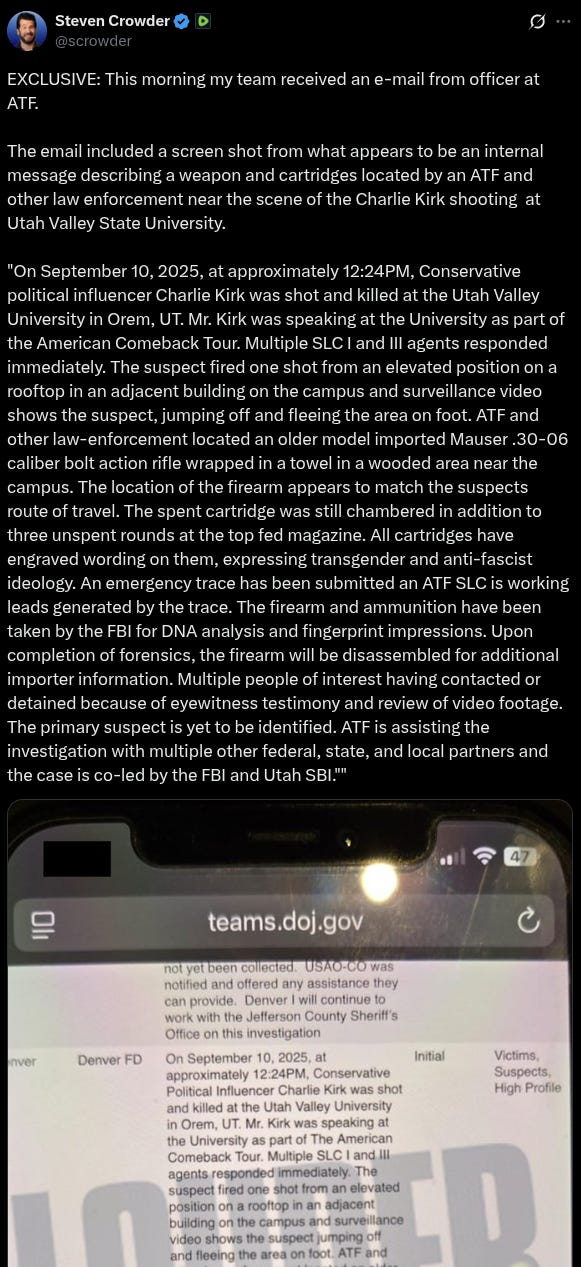 Separate from the press conference, the Wall Street Journal confirmed (following an initial report by Steven Crowder) that the "older-model .30 caliber hunting rifle" used in the assassination contained "ammunition engraved with expressions of transgender and antifascist ideology inside the rifle." Additional details about the weapon will be provided at the end of this note.