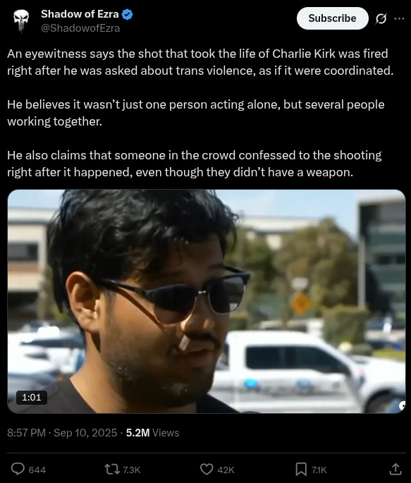 Let's take a step back. Yesterday, an alleged eyewitness said Kirk was shot around the same time that someone in the crowd "was asked about trans violence."