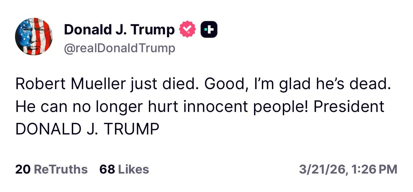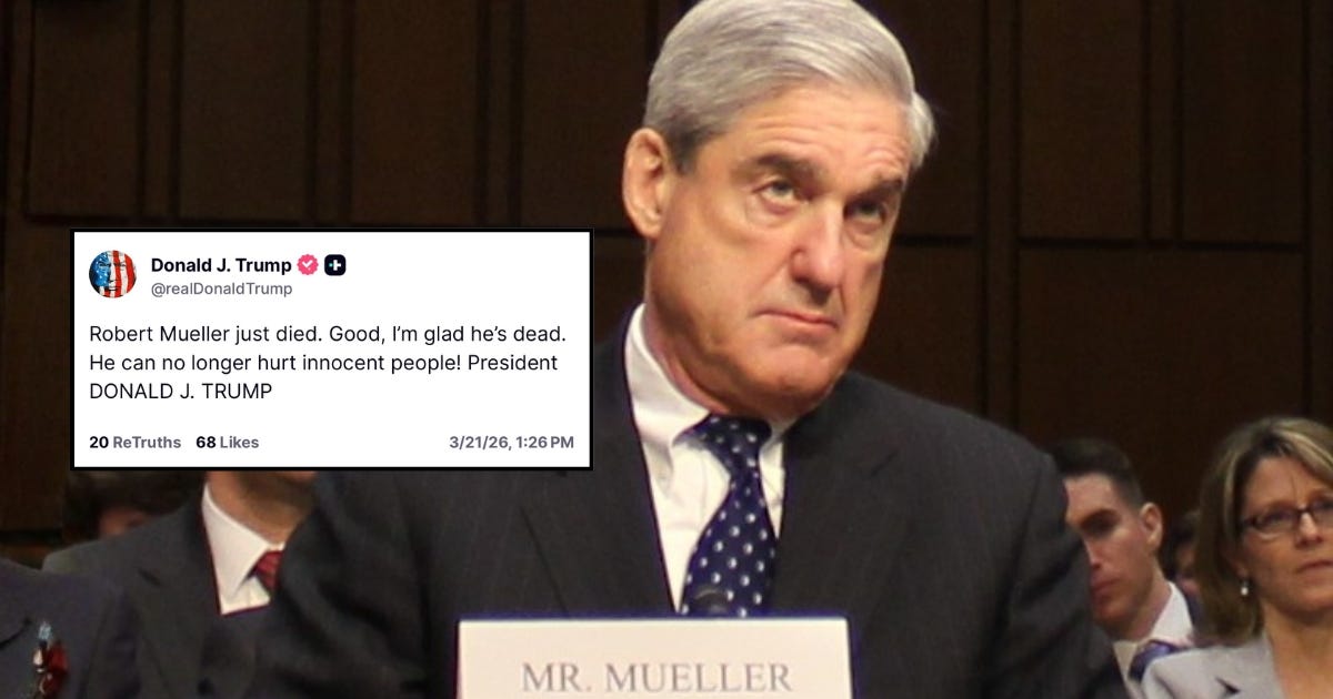In response, President Trump took to Truth Social to dance on his grave - writing “Robert Mueller just died. Good, I’m glad he’s dead. He can no longer hurt innocent people! President DONALD J. TRUMP.”