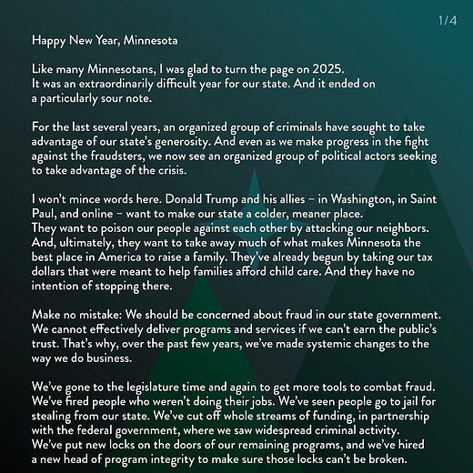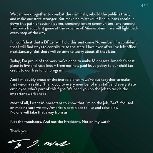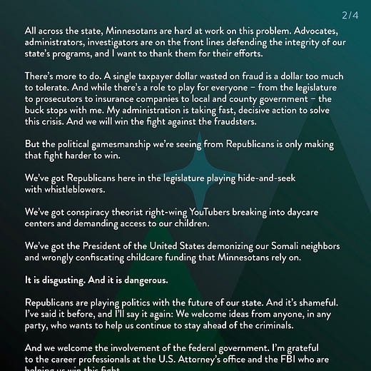 “For the last several years, an organized group of criminals have sought to take advantage of our state’s generosity. And even as we make progress in the fight against the fraudsters, we now see an organized group of political actors seeking to take advantage of the crisis,” Walz said in the statement. “I won’t mince words here. [President] Donald Trump and his allies – in Washington, in St. Paul, and online – want to make our state a colder, meaner place. They want to poison our people against each other by attacking our neighbors. And, ultimately, they want to take away much of what makes Minnesota the best place in America to raise a family. They’ve already begun by taking our tax dollars that were meant to help families afford child care. And they have no intention of stopping there.”