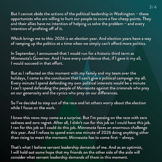 “I know this news may come as a surprise. But I’m passing on the race with zero sadness and zero regret,” Walz added. “After all, I didn’t run for this job so I could have this job. I ran for this job so I could do this job. Minnesota faces an enormous challenge this year. And I refuse to spend even one minute of 2026 doing anything other than rising to meet the moment. Minnesota has to come first – always.”