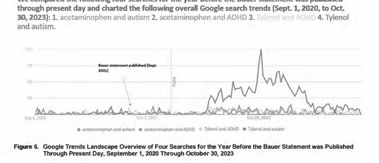 The company also conducted research it described as “social listening” by tracking Google searches and social media posts seeking evidence about Tylenol and autism from January 2020 through October 2023. The company initiated the social media trends research after the 2021 publication of a call to action on Tylenol in Nature Reviews Endocrinology by 13 U.S. and European experts “in light of the serious consequences of inaction.”