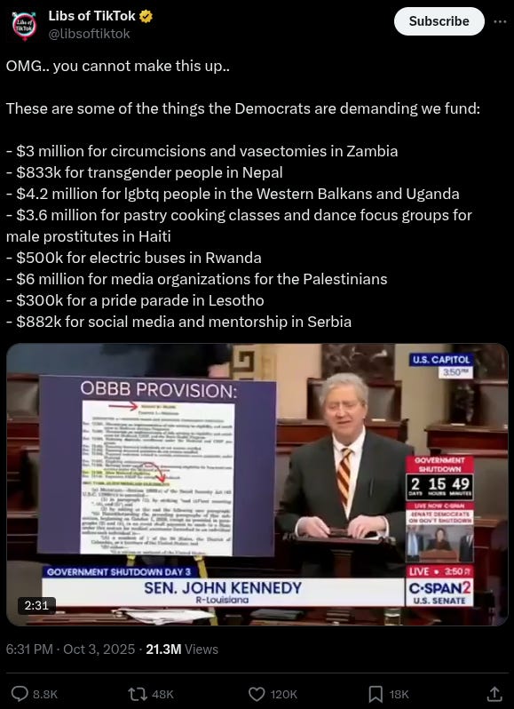 Senator John Kennedy (R-LA) has been vocal about the Schumer shutdown. Kennedy recently listed a bunch of the crazy items that AOC and other far-left Democrats are pushing for at the expense of the American people.