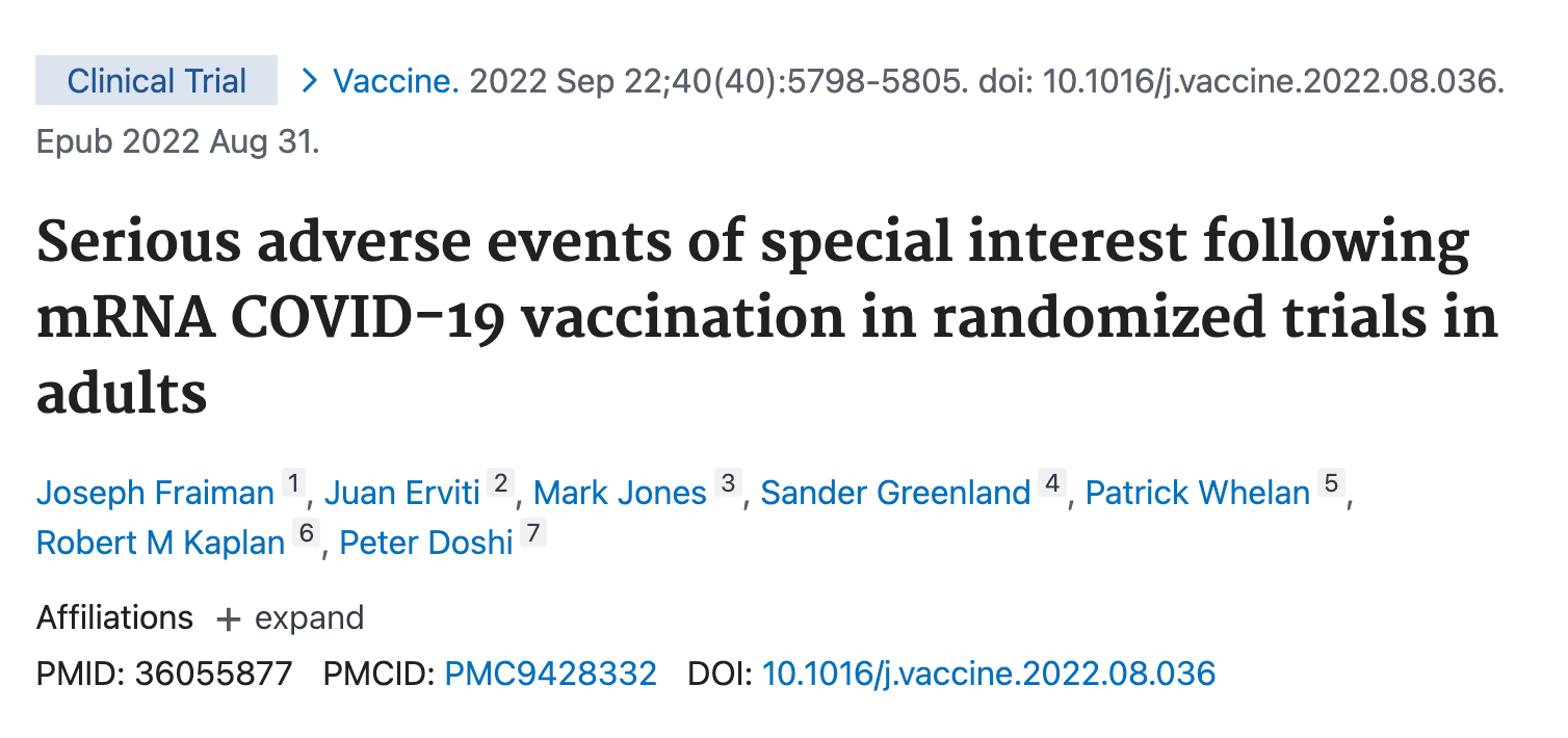In 2022, the same year Dr. Hatfill said the data began piling up, Joseph Fraiman and colleagues published a reanalysis of the Pfizer and Moderna trials, showing that the number of serious post-vaccine adverse events far EXCEEDED the number of hospitalizations prevented.