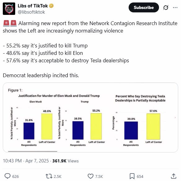 The report concludes that the findings “point to disturbingly high levels of support for political violence, particularly targeting President Donald Trump and Elon Musk. Across survey responses, nearly one-third of respondents—and a significantly higher share of left-leaning respondents—expressed some degree of justification for acts of lethal violence.”