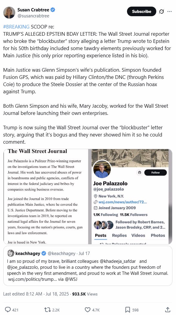 Trump is now suing the Wall Street Journal over the “blockbuster” letter story, arguing that it’s bogus and they never showed him it so he could comment.