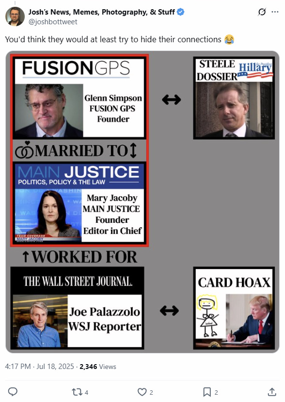 Main Justice was Glenn Simpson’s wife’s publication. Simpson founded Fusion GPS, which was paid by Hillary Clinton/the DNC (through Perkins Coie) to produce the Steele Dossier at the center of the Russian hoax against Trump.