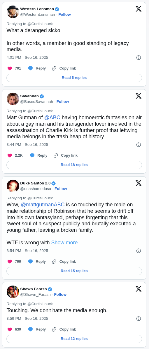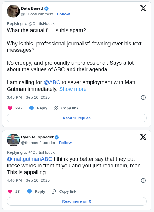 ABC News reporter Matt Gutman described text messages that Charlie Kirk’s assassin Tyler Robinson sent to his transgender lover admitting to killing Kirk as “very touching.”