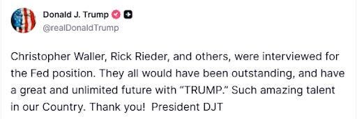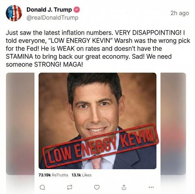 “I am pleased to announce that I am nominating Kevin Warsh to be the CHAIRMAN OF THE BOARD OF GOVERNORS OF THE FEDERAL RESERVE SYSTEM.”
