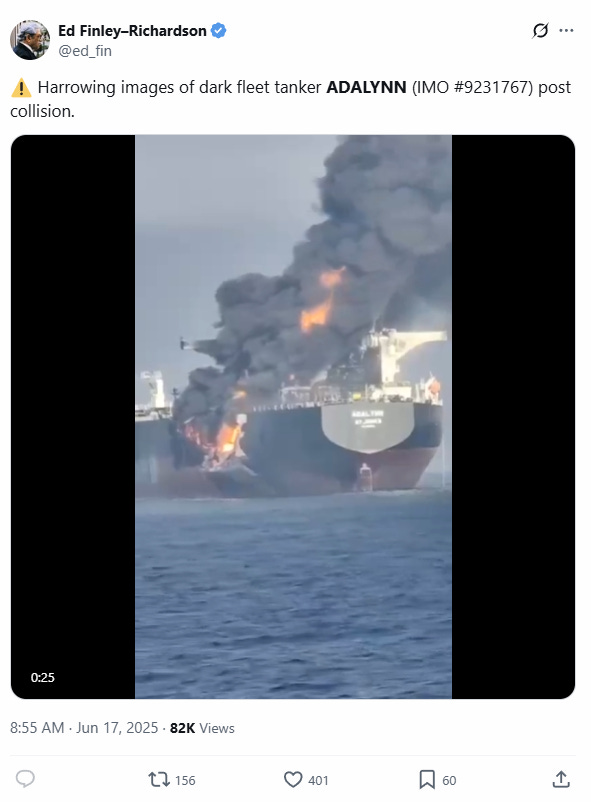Which unfolded into a maritime disaster early Tuesday when crude oil tanker Front Eagle slammed into the port quarter of the tanker Adalynn, sparking a massive fire on Adalynn, and concerns about a potential ecological disaster have surged.