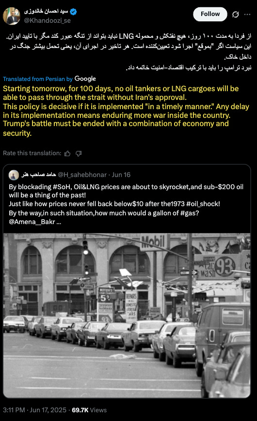 The most concerning sign of potential maritime disruption in the Strait of Hormuz emerged in the overnight hours via a statement on X by former Iranian Economy Minister Ehsan Khandouzi. While unofficial, the timing and seniority of the comment may reflect broader regime sentiment—or serve as a warning of what's to come.