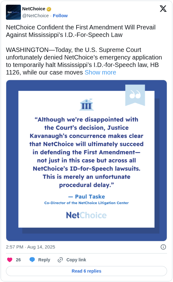 “Although we’re disappointed with the Court’s decision, Justice Kavanaugh’s concurrence makes clear that NetChoice will ultimately succeed in defending the First Amendment—not just in this case but across all NetChoice’s ID-for-Speech lawsuits,” he said.
