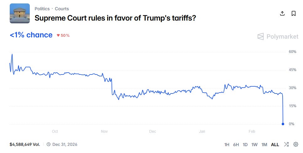 The Supreme Court on Friday struck down Trump’s tariffs. In a 6-3 decision (170-pages), the court ruled that Trump’s use of the 1977 International Emergency Economic Powers Act (IEEPA) - which constitute about half of the tariffs we’ve seen under Trump - was not lawful. Kavanaugh, Thomas and Alito dissented.