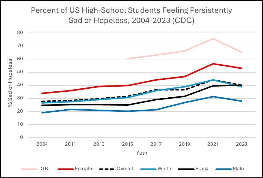 But not entirely. Mental illness fell after the pandemic but the sexuality and gender shifts happened at least a year later. All groups, including LGBT, got less mentally ill after the pandemic.