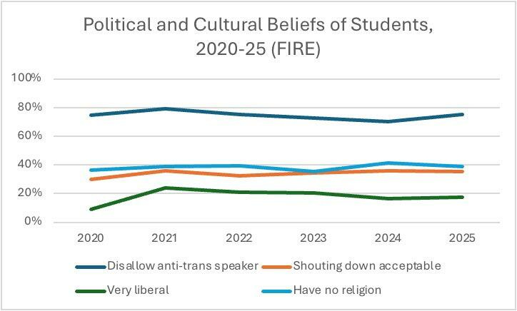 What explains the sudden reversal of trans and queer? It’s not because the kids became less woke, more religious or more conservative. Those beliefs remained stable throughout the 2020s.
