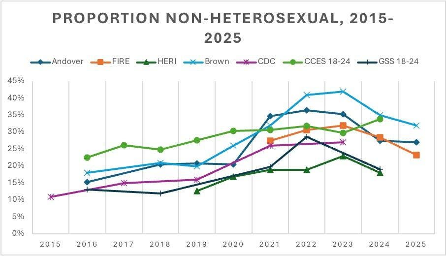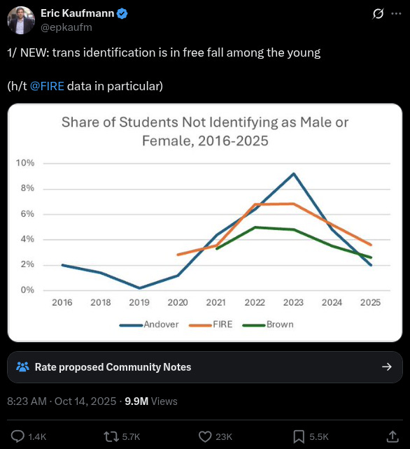 Kaufmann on X published a wild chartpack (view here) that shows the data (cited from major youth surveys, including FIRE, HERI, Brown Daily Herald, Andover Phillips Academy, CCES, GSS, and CDC YRBSS) that shows the trans bubble has popped.