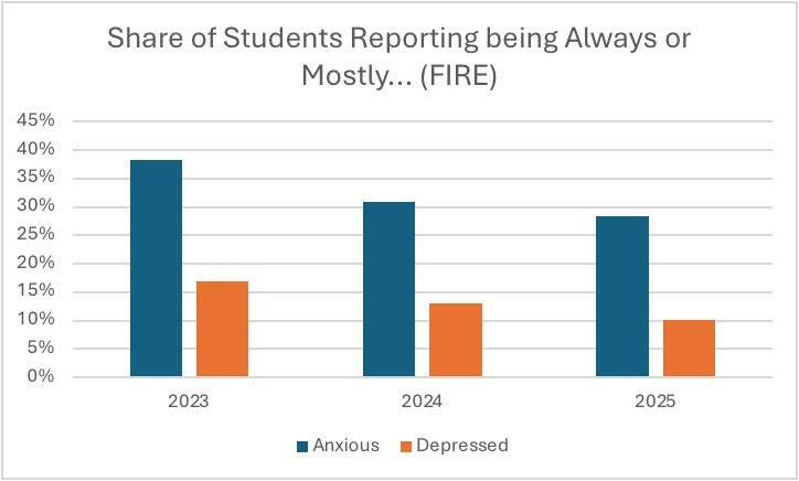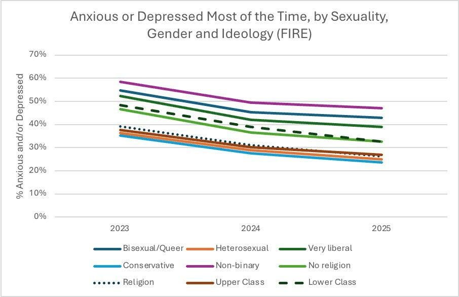 Is it improved mental health? Yes, in part. Less anxious and, especially, depressed, students is linked with a smaller share identifying as trans, queer or bisexual.