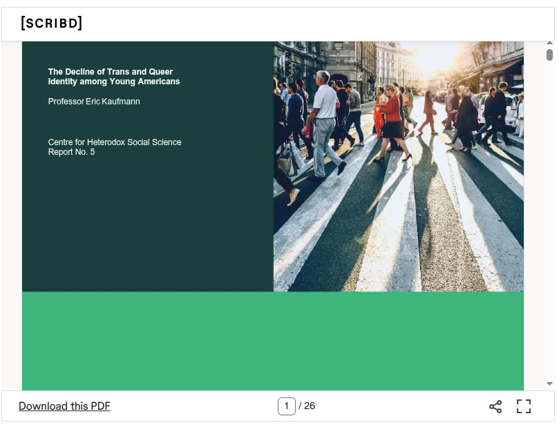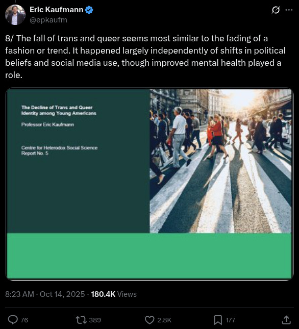 In Kaufmann’s report titled “The Decline of Trans and Queer Identity among Young Americans,” he discovered that since 2023, both trans and queer identification have fallen sharply among members of Generation Z.