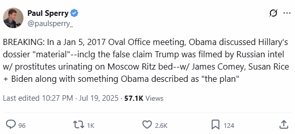 Per Paul Sperry: In the January 5, 2017 Oval Office meeting, Barack Obama discussed Hillary’s dossier “material”–including the false claim Trump was filmed by Russian intel with prostitutes urinating on Moscow Ritz bed “golden showers” – with James Comey, Susan Rice and Joe Biden along with something Obama described as “the plan.”