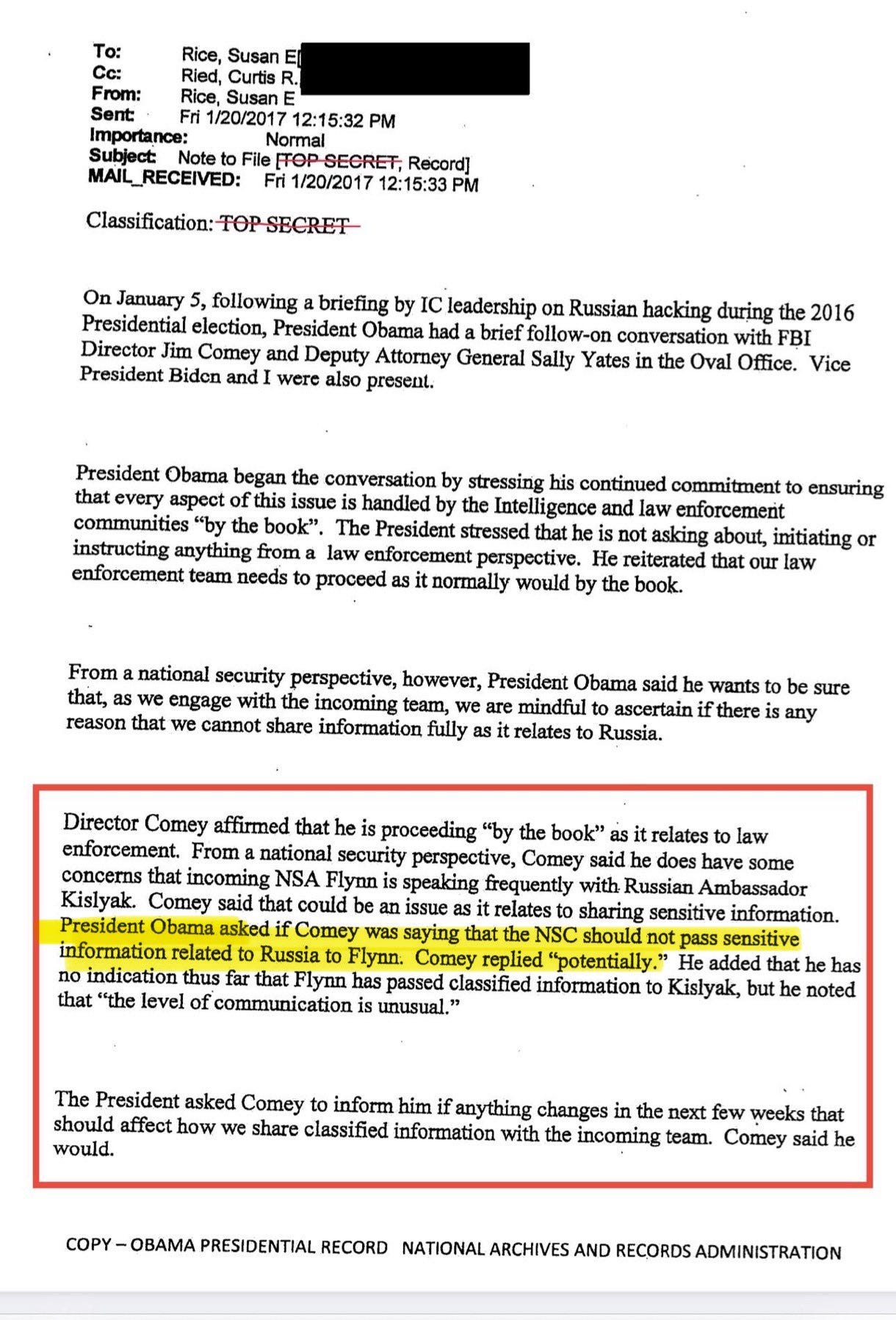 Sperry: Now we know why Susan Rice sent this CYA “Note to File” email to herself 15 days after Obama hatched the dossier “plan” with her, Comey and Biden in the Oval Office. After the fact, she claimed Obama stressed the FBI and CIA handle the issue “by the book:”