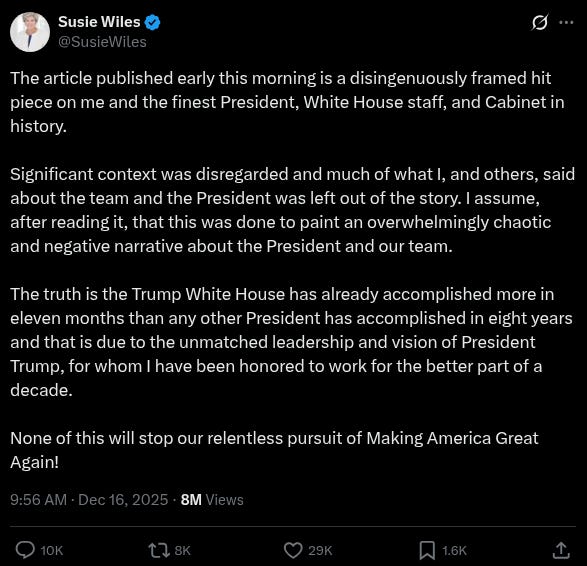 “Significant context was disregarded and much of what I, and others, said about the team and the President was left out of the story,” Wiles wrote in her first post on X in over a year. “I assume, after reading it, that this was done to paint an overwhelmingly chaotic and negative narrative about the President and our team.”