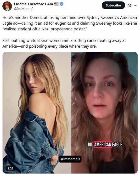 Perhaps liberals are furious that no men are pretending to be women in this ad, or that Sweeney isn't morbidly obese and promoting unhealthy leftist body positivity. One thing is clear: after a decade of failed woke marketing, corporate America has finally understood that fat and ugly don't sell.