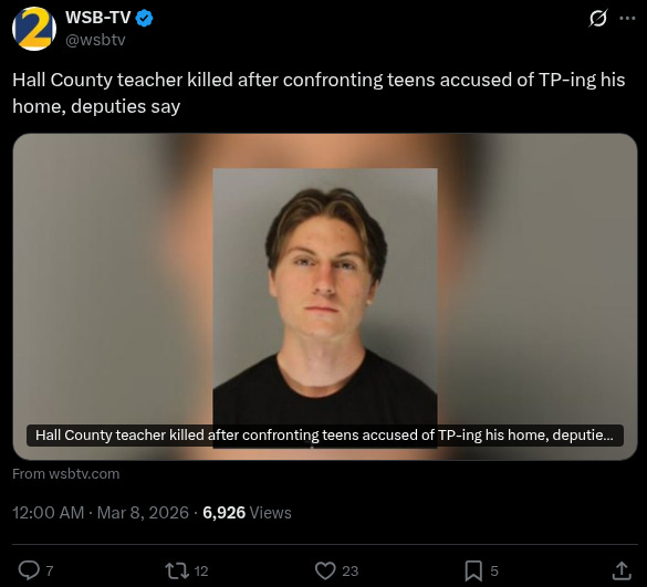 A 40-year-old Georgia math teacher is dead after a late-night toilet-papering prank outside his home turned fatal Friday.
