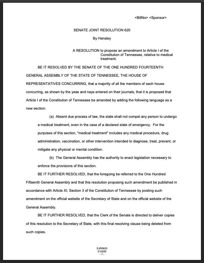 Senate Joint Resolution 620 (SJR0620), sponsored by Senator Joseph Hensley (R), a medical doctor, proposes adding a new section to Article I of the Tennessee Constitution establishing that: