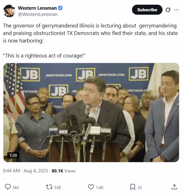Their choice of exile location is positively drenched in hypocrisy, as Illinois arguably has the worst gerrymandering in America -- to Democrats' benefit, of course. In 2024, Democrats won 53% of the popular vote in Illinois House races, but took 82% of the seats (14 out of 17).