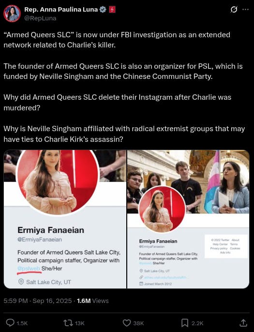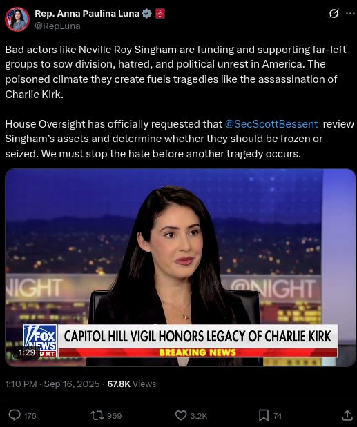 "Bad actors like Neville Roy Singham are funding and supporting far-left groups to sow division, hatred, and political unrest in America. The poisoned climate they create fuels tragedies like the assassination of Charlie Kirk," Luna wrote in a separate X post.