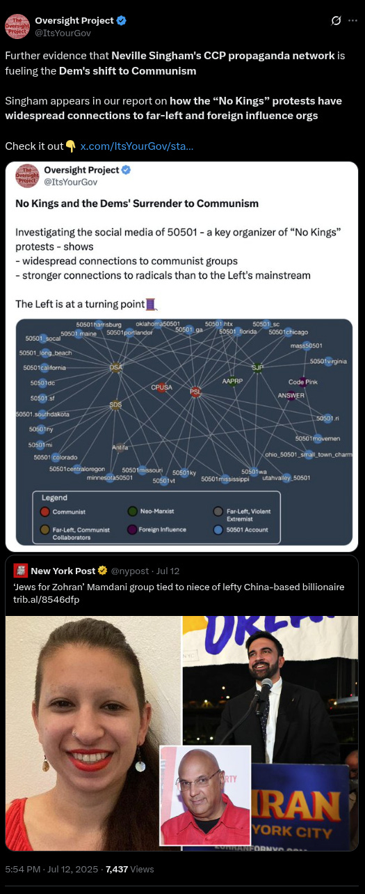 She noted, "House Oversight has officially requested that @SecScottBessent review Singham's assets and determine whether they should be frozen or seized. We must stop the hate before another tragedy occurs."