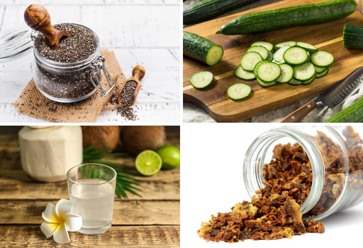 Try coconut water, bee propolis, tulsi, hibiscus, and cucumber.