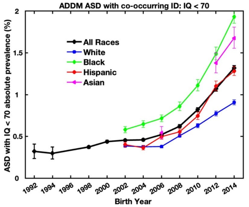 Based on those numbers, Nevison estimated that by 2014, nearly 2% of all Black children had an autism diagnosis with co-occurring intellectual disability.