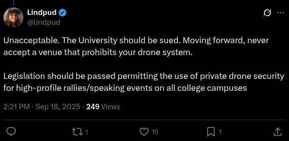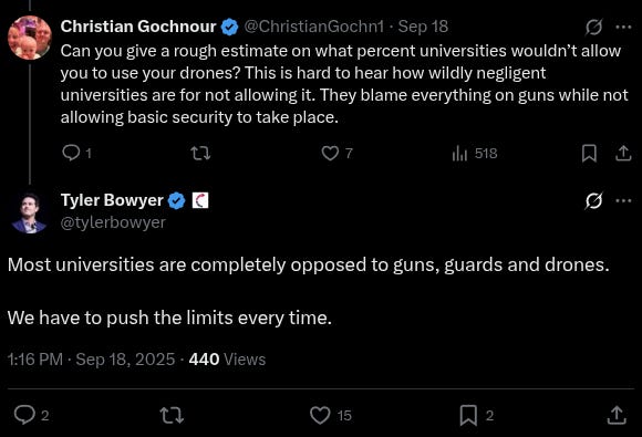 Bowyer added that most Universities don’t allow the drones or even armed security for events like TPUSA’s.