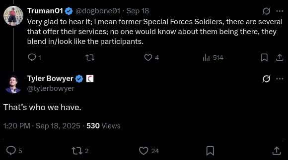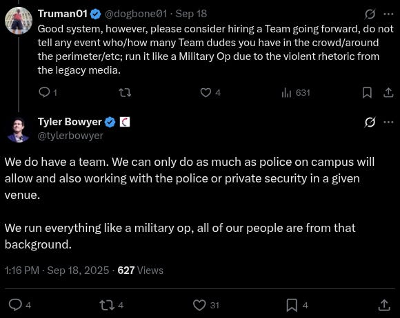 Bowyer also revealed that Turning Point uses former special forces security experts, but suggested there was nothing more they could have done on the day.