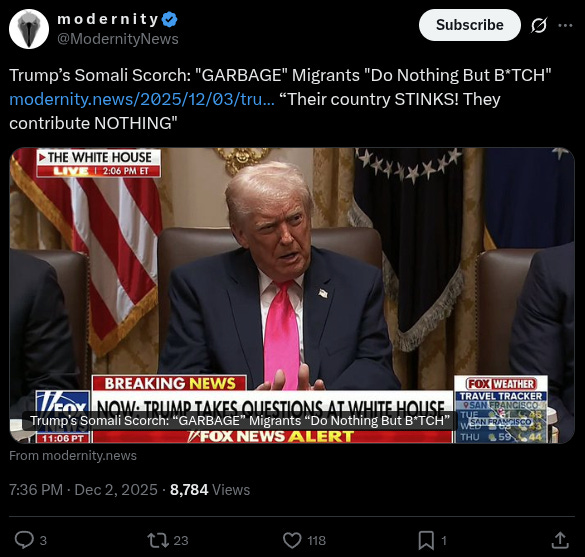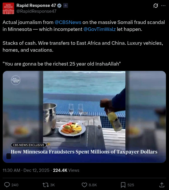 He hammered the fraud: “I’m understanding Somalians ripped Minnesota that place for billions of dollars! And they contribute nothing. The welfare’s like 88%!”