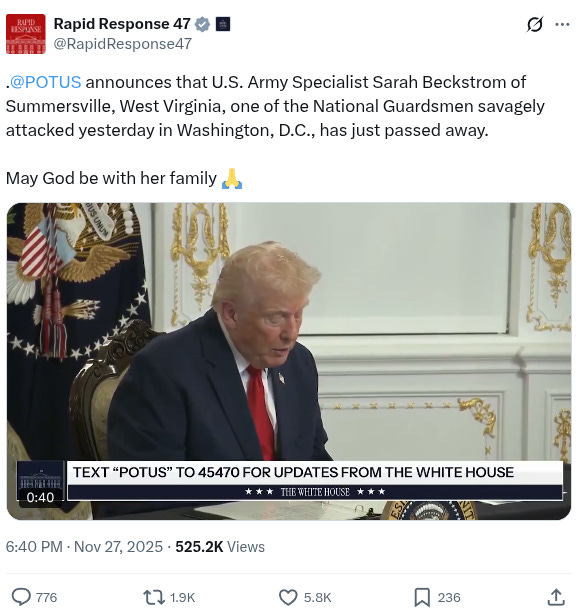 âSarah Beckstrom of West Virginia, one of the guardsmen that weâre talking about, highly respected, young, magnificent person, started service in June of 2023 outstanding in every way. Sheâs just passed away,â Trump said as he was about to call servicemenbers for Thanksgiving.