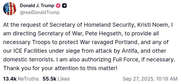 “At the request of Secretary of Homeland Security, Kristi Noem, I am directing Secretary of War, Pete Hegseth, to provide all necessary Troops to protect War ravaged Portland, and any of our ICE Facilities under siege from attack by Antifa, and other domestic terrorists,” Trump wrote on Truth Social.