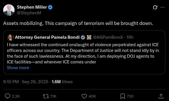 Stephen Miller, the White House deputy chief of staff for policy, Bondi’s post, noting that “Assets mobilizing. This campaign of terrorism will be brought down.”