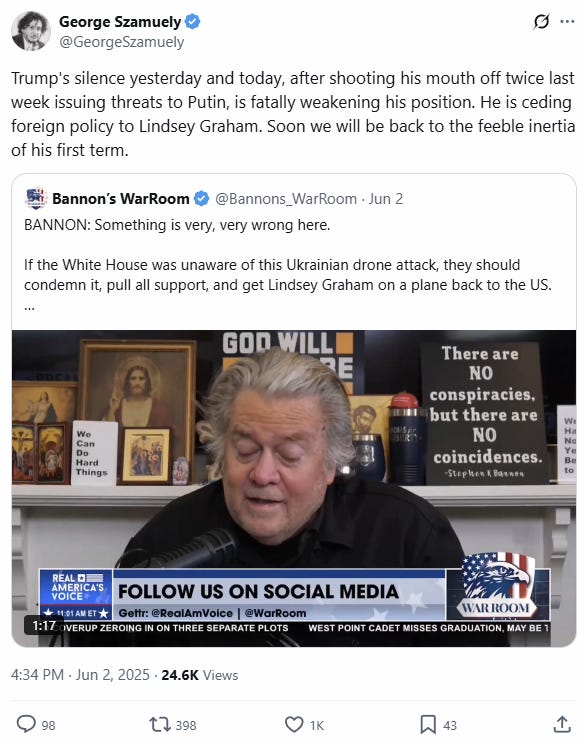 After two days of deafening silence from the White House on Ukraine's Sunday massive drone assault, dubbed 'Operation Spider's Web' - which took out many key Russian aircraft, including long-range strategic bombers and likely even Russia's extremely rare A-50 Radar Plane - President Trump has finally reacted publicly.