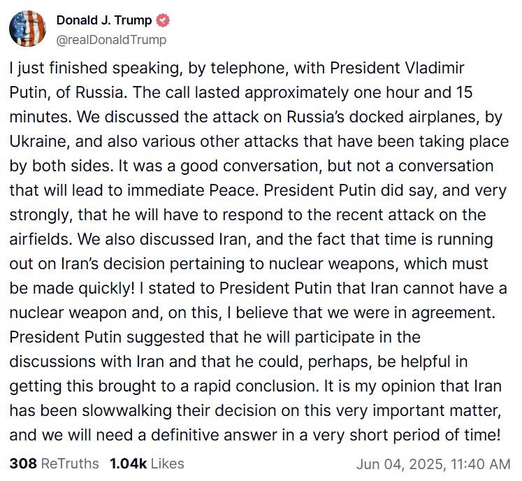 Much different tone than "playing with fire" Truth post. Two leaders discussed Ukraine drone strikes and "various other attacks...by both sides." Trump accepted that Putin will retaliate, and it will be big. Trump admits "immediate peace" not coming.