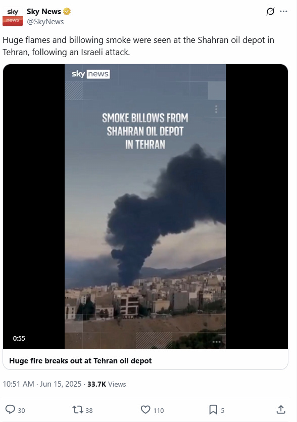 Regional sources are reporting on Sunday the highest number of observed strikes in daylight in an around Tehran. Israel's military says that over 80 sites were hit overnight, and has vowed to "hunt down" ballistic missile launchers in western Iran. Radar and anti-air defense batteries were also struck "as part of the IDF’s aerial superiority in Iranian airspace."