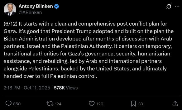 “It starts with a clear and comprehensive post conflict plan for Gaza. It’s good that President Trump adopted and built on the plan the Biden Administration developed after months of discussion with Arab partners, Israel and the Palestinian Authority. It centers on temporary, transitional authorities for Gaza’s governance, security, humanitarian assistance, and rebuilding, led by Arab and international partners alongside Palestinians, backed by the United States, and ultimately handed over to full Palestinian control,” Blinken said on X.