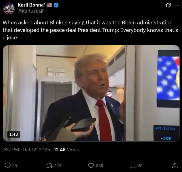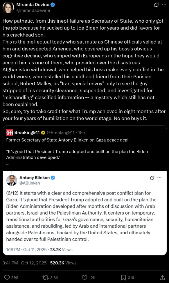 Meanwhile, Antony Blinken is giving Joe Biden credit for President Trump’s historic ceasefire agreement between Israel and Hamas.