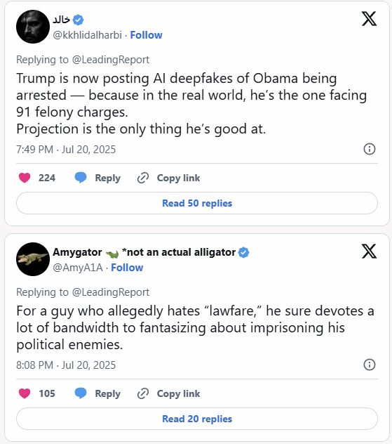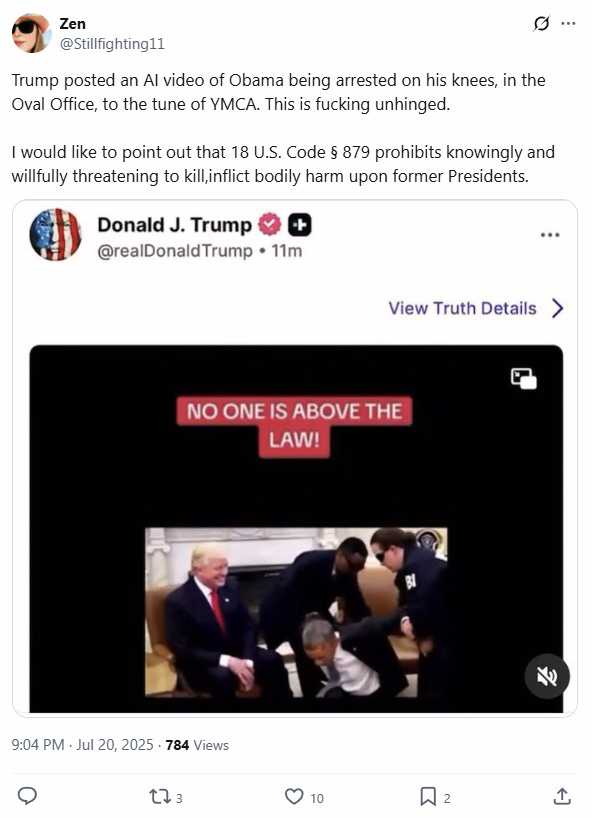 Trump Posts AI Video of Obama Being Arrested, Handcuffed as He Gleefully Watches
