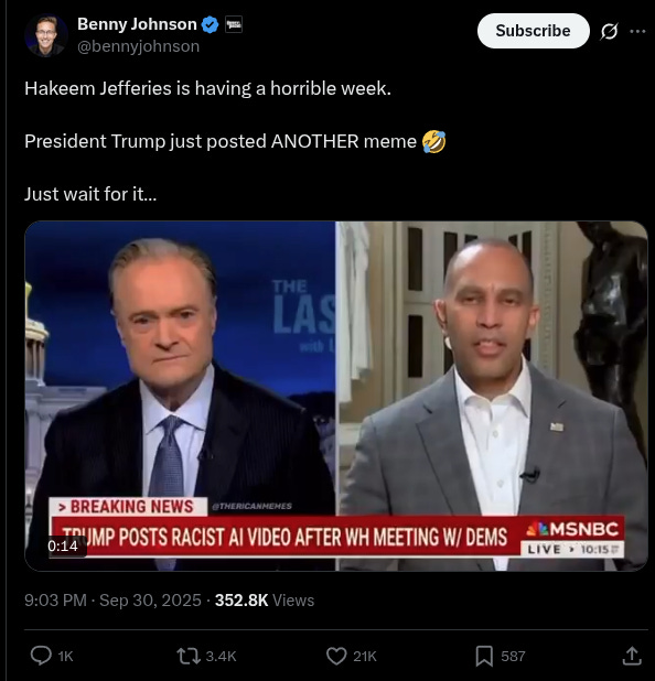 The Democrat position on the shutdown is untenable. They demand that Trump undo provisions of the “Big Beautiful Bill” that cut ACA (Affordable Care Act) subsidies to millions of illegal migrant who qualify under asylum provisions. They also want the White House to rehire thousands of federal workers fired during the shutdown, they want funding returned to PBS and NPR, and they want a repeal of work requirements for food stamp recipients.