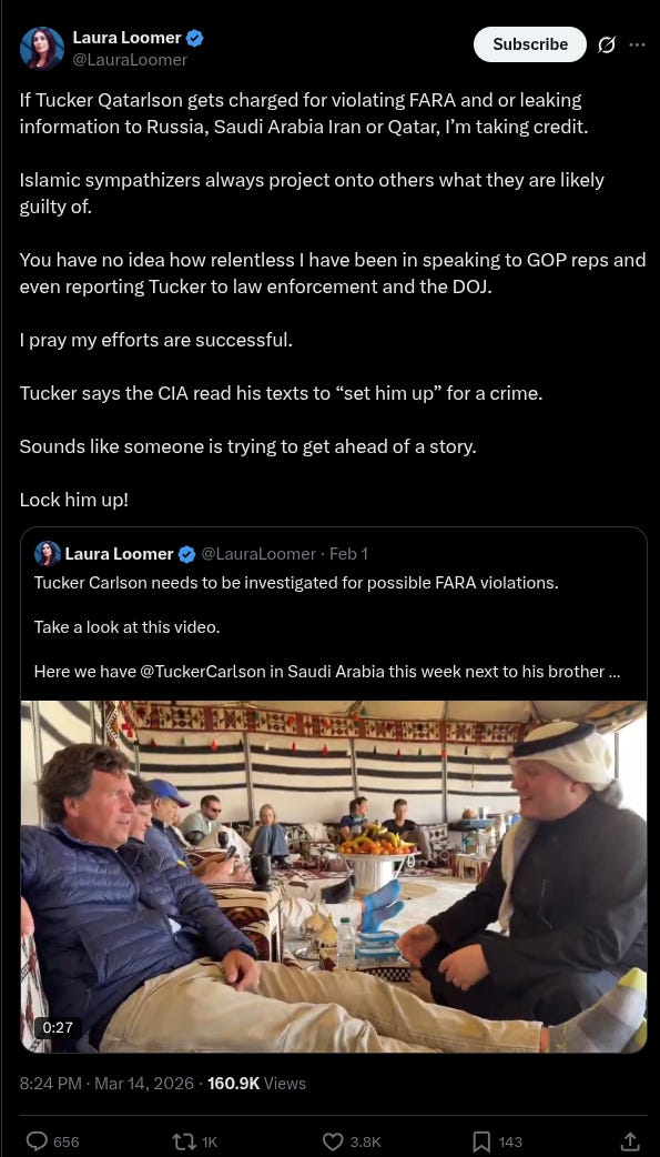 Loomer resurfaced a February 2026 video of Carlson in Saudi Arabia alongside his brother Buckley Carlson and Tucker Carlson Network CEO Neil Patel, suggesting it showed improper foreign influence.