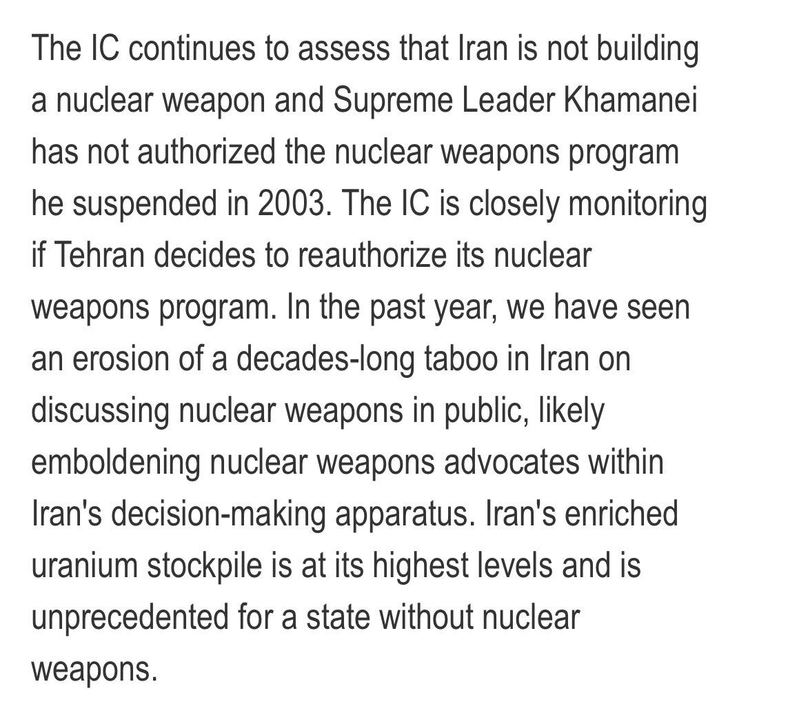 “The [Intelligence Community] continues to assess that Iran is not building a nuclear weapon and Supreme Leader Khomeini has not authorized the nuclear weapons program that he suspended in 2003,” Gabbard said.